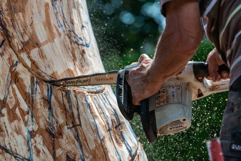 Always maintain a firm grip on the handles and ensure a safe distance from bystanders․ Keep the chainsaw away from children and pets․ Avoid operating in wet or slippery conditions․ Never cut above shoulder height or reach awkwardly, as this can cause loss of control․ Ensure the chain is sharp and properly tensioned to prevent kickback․ Keep the saw at a comfortable cutting angle and avoid overreaching․ Follow all safety guidelines in the manual to minimize risks and ensure safe operation․ Proper handling practices are crucial for preventing accidents and maintaining control of the chainsaw․